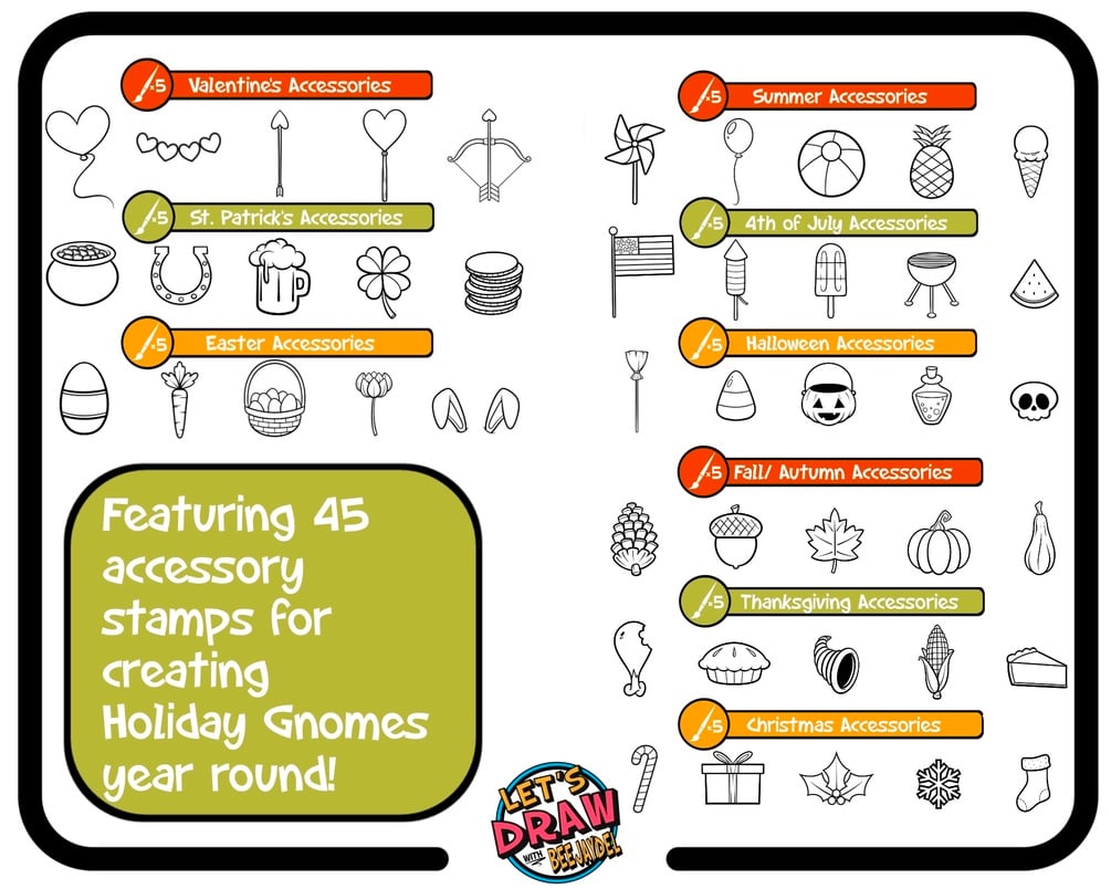 -100 Procreate Brushes (10 Hats, 10 Beards, 10 Feet, 10 Hands, 5 Bodies, 5 Noses, 5 Arms, & 45 Accessories featuring brushes for Valentine's, St. Patrick's, Easter, Summer, 4th of July, Halloween, Fall/Autumn, Thanksgiving, and Christmas.)
