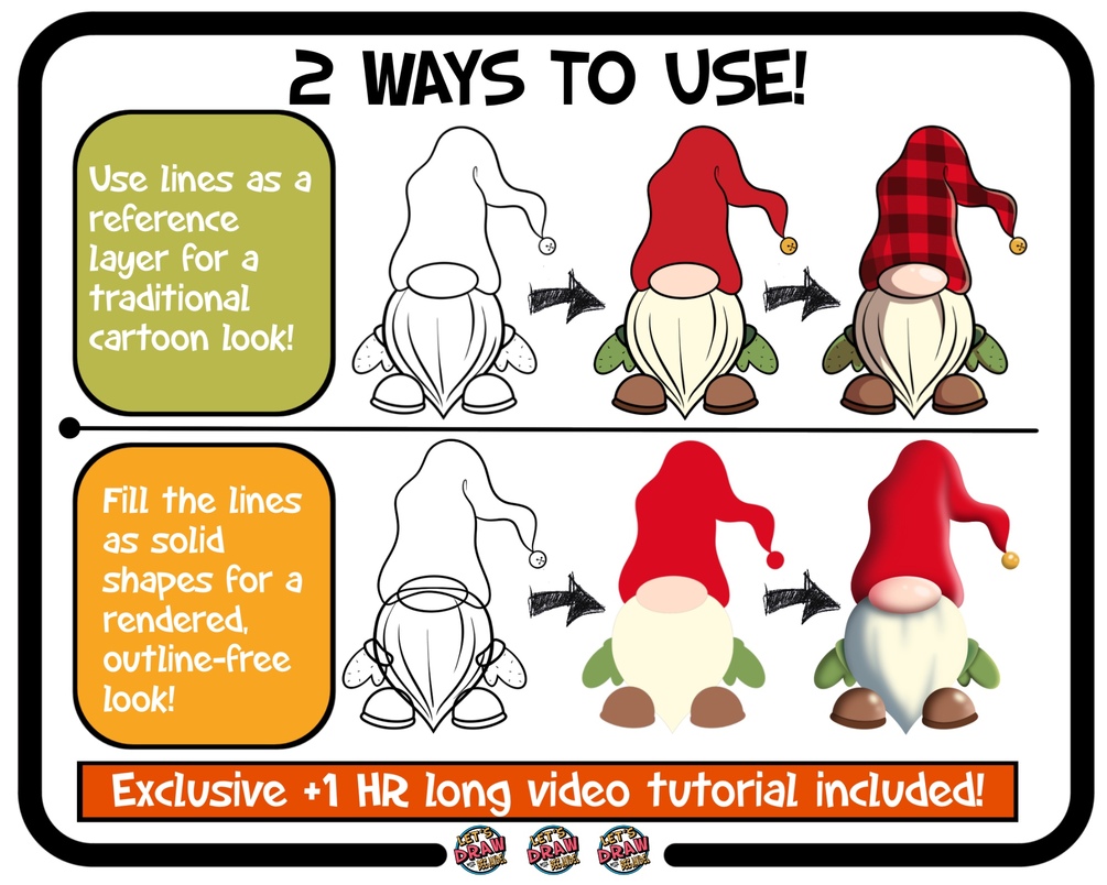 We’ve all been there as artists…you stare at a blank canvas for what seems like hours. Waiting for inspiration. Waiting for the creative juices to start flowing. Waiting for something…ANYTHING…to happen! Well, if that sounds familiar…I made this new Gnome Creator Pack with you in mind! You get a total of 100 hand drawn stamp brushes grouped by type (hats, beards, feet, hands, bodies, noses, arms, and accessories) that will help to jump start your drawing process! Pick a hat shape brush and touch the screen…BOOM! Pick a beard brush and touch the screen…BAM! Grab a nose brush and tap that display again…POW! You’re on your way to creating an awesome cartoon gnome! It doesn’t matter if you ONLY use the elements included or if you decide to add your own creative flair to the tools in this set…you are bound to make something AMAZING!!!