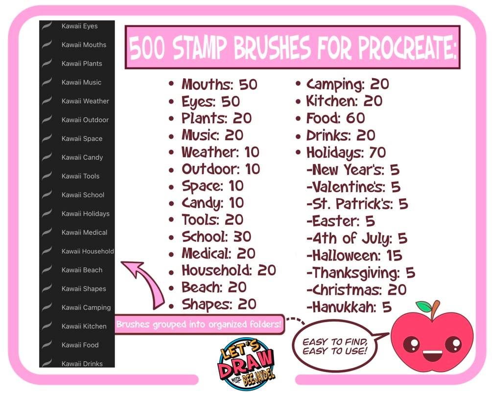 -500 Procreate Brushes: Mouths: 50, Eyes: 50, Plants: 20, Music: 20, Weather: 10, Outdoor: 10, Space: 10, Candy: 10, Tools: 20, School: 30, Medical: 20, Household: 20, Beach: 20, Shapes: 20, Camping: 20, Kitchen: 20, Food: 60, Drinks: 20, Holidays: 70 (New Year’s: 5, Valentine’s: 5 , St. Patrick’s: 5, Easter: 5, 4th of July: 5, Halloween: 15, Thanksgiving: 5, Christmas: 20, Hanukkah: 5)