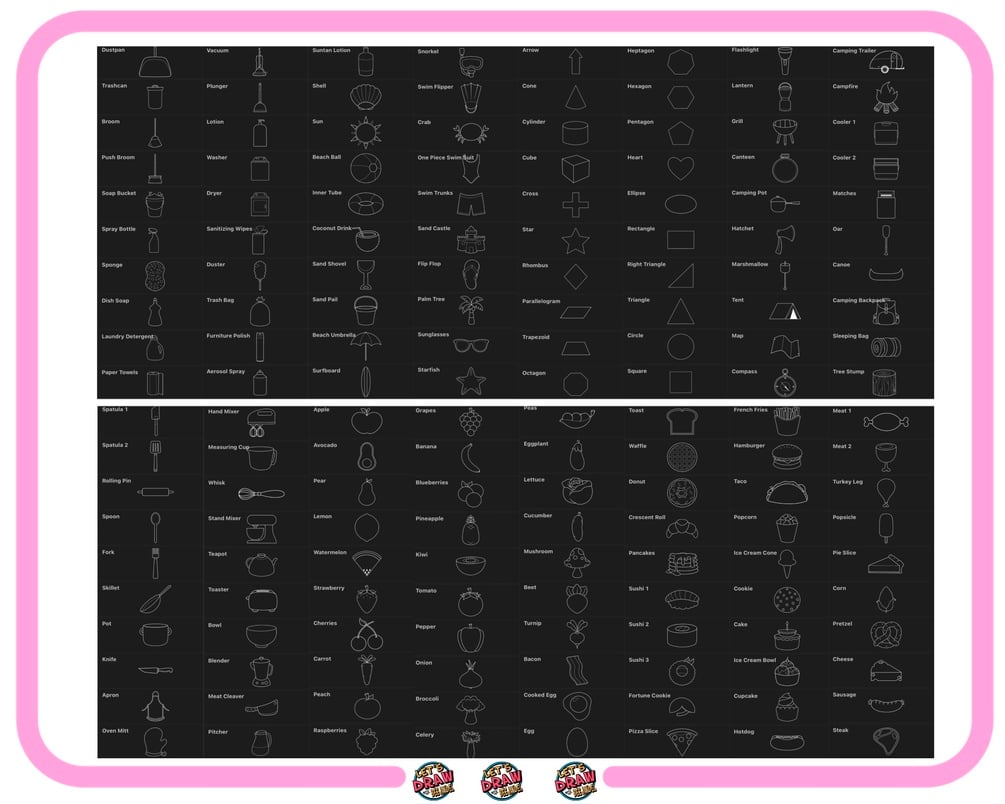 -500 Procreate Brushes: Mouths: 50, Eyes: 50, Plants: 20, Music: 20, Weather: 10, Outdoor: 10, Space: 10, Candy: 10, Tools: 20, School: 30, Medical: 20, Household: 20, Beach: 20, Shapes: 20, Camping: 20, Kitchen: 20, Food: 60, Drinks: 20, Holidays: 70 (New Year’s: 5, Valentine’s: 5 , St. Patrick’s: 5, Easter: 5, 4th of July: 5, Halloween: 15, Thanksgiving: 5, Christmas: 20, Hanukkah: 5)