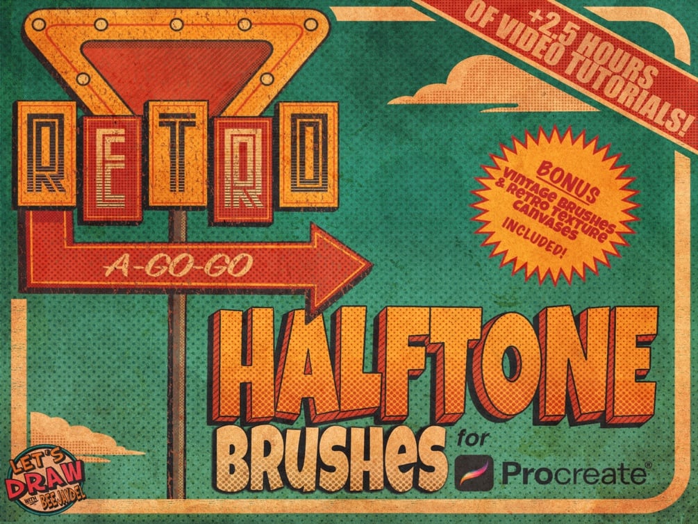 Retro A-Go-Go! Halftone Toolkit for Procreate: 494 Brushes, Vintage Texture Canvases, +2.5 Hours of Video Tutorials!