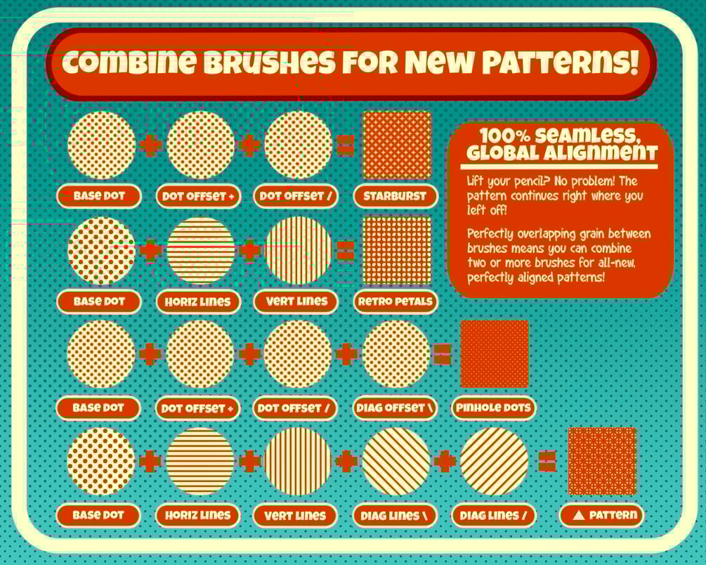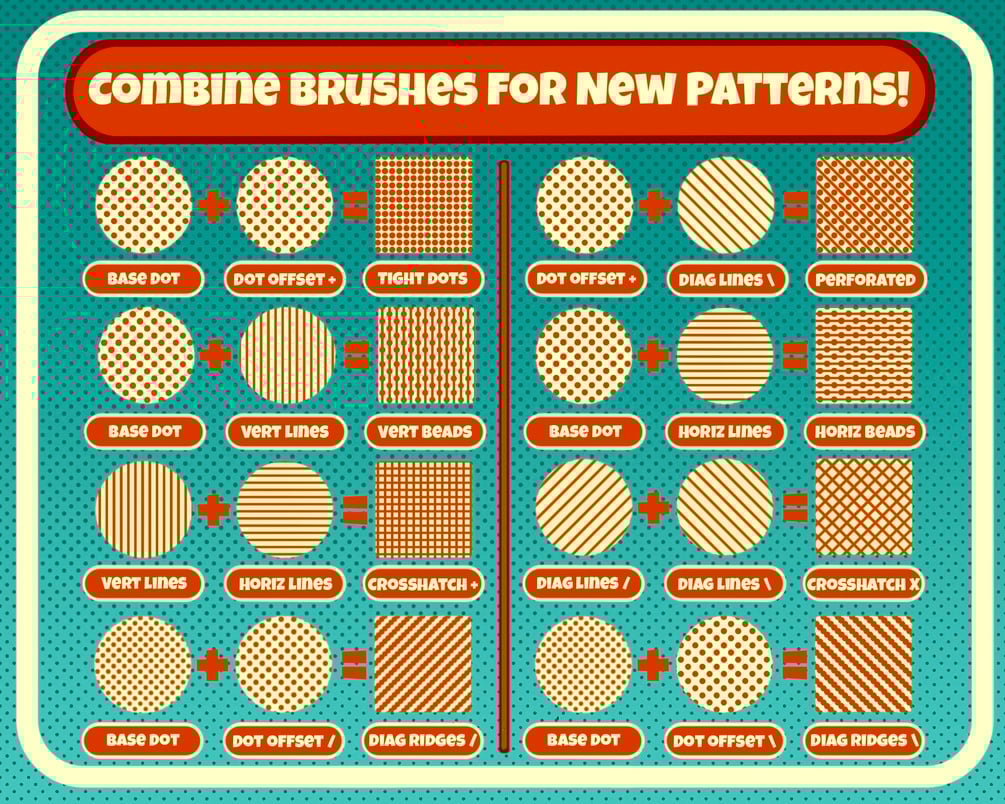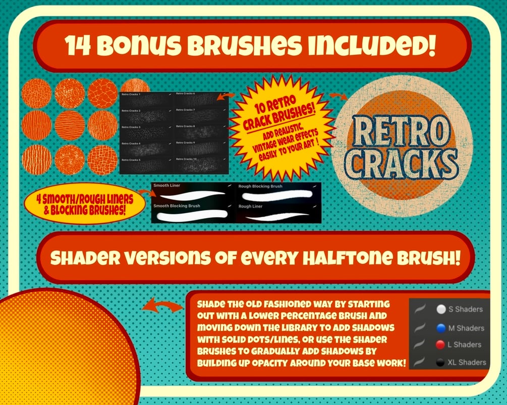 Bring the charm of vintage print to your iPad with this massive, nostalgia-fueled halftone brush set inspired by classic comics, pulp prints, and mid-century design!