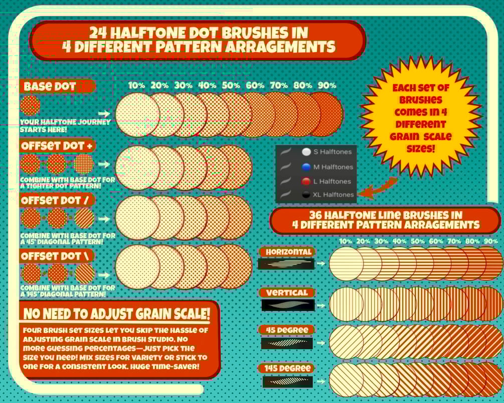 To get seamless results with halftone brushes in Procreate, you need to adjust the Grain Scale in Brush Studio—this controls the size of the dots or lines your brush makes. (The regular brush size slider only changes the overall size of the brush shape, not the halftone pattern itself.) With other halftone brush sets, you have to manually tweak the Grain Scale setting every time you switch brushes or change canvas sizes in order to keep a consistent pattern. That means jumping into Brush Studio, remembering numbers, and guessing your last setting—every single time. My halftone brushes solve that. I’ve created every brush in Small, Medium, Large, and XL versions (each in their own separate set), so you can instantly switch between different grain sizes without ever touching Brush Studio. Just pick the set that fits your canvas size and go. Want to mix grain sizes across your piece? Easy. Prefer to stick with one for a consistent look? Done. It’s a massive time-saver—and one of the most useful features of this set.