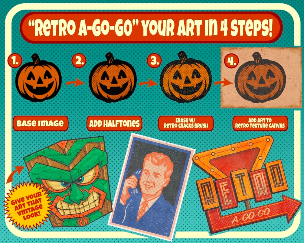 These aren’t just halftone brushes — this is an entire retro illustration toolkit built from the ground up to give your work that perfectly imperfect vintage vibe. This pack includes everything: crisp dot halftones and lines , vintage wear brushes for distressing, retro texture canvases for an authentic look, and over three hours of video tutorials…all designed to help you “Retro A-Go-Go” your artwork in just a few steps!