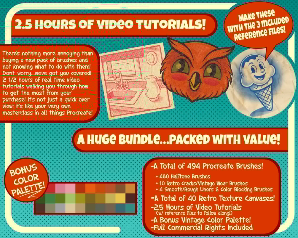 A Total of 494 Procreate Brushes: 480 Halftone Brushes, 10 Retro Cracks/Vintage Wear Brushes, 4 Smooth/Rough Liners & Color Blocking Brushes // A Total of 40 Retro Texture Canvases! // 2.5 Hours of Video Tutorials (w/ reference files to follow along!) // A Bonus Vintage Color Palette! // Full Commercial Rights Included!
